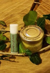 Un baume à lèvre (macérat huileux de tilleul, cire d’abeille, propolis) (5€) Une crème protectrice visage 20 ml (macérat huileux de lavande, cire d’abeille, HE géranium rosat)(5€)